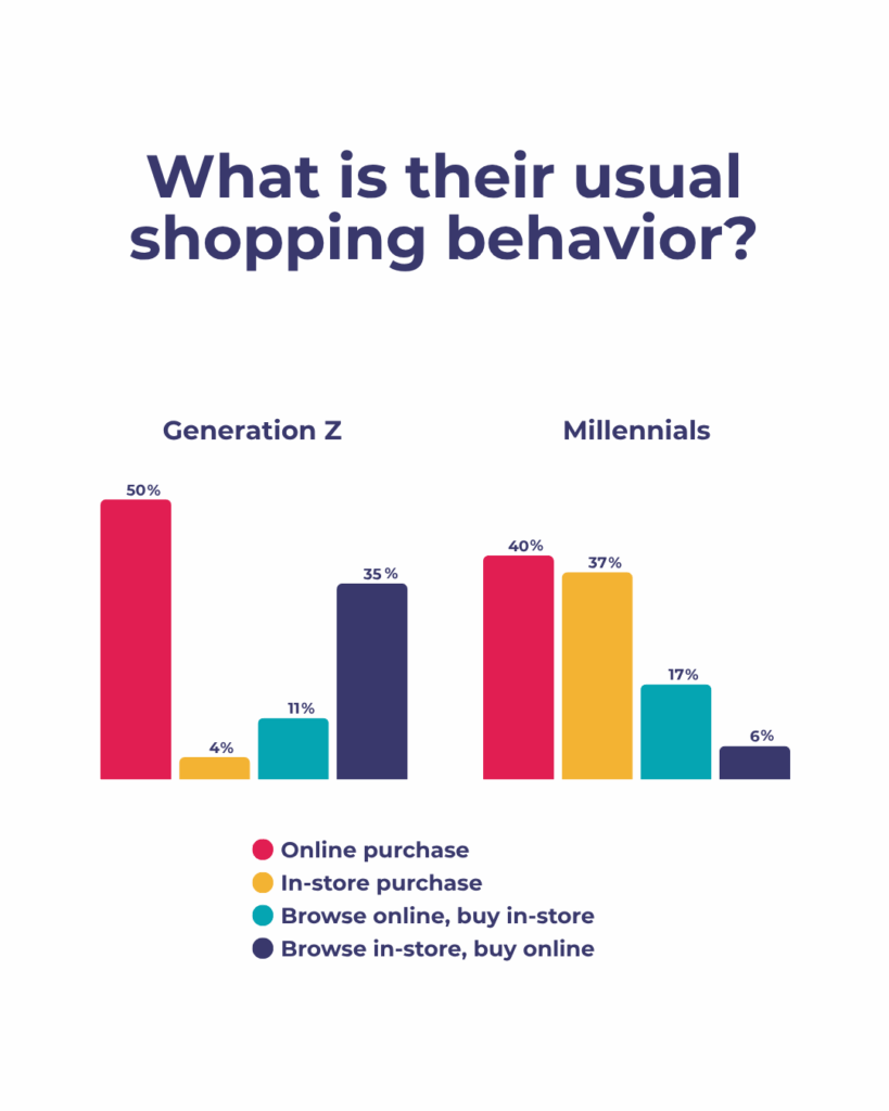 Despite their strong preference for credit and debit cards, Millennials show balanced shopping behavior. Their online and offline purchase habits are nearly identical: 40% prefer shopping online, while 37% favor physical stores. This small difference highlights how this generation values both the immediacy of ecommerce and the in-person experience of physical shops.