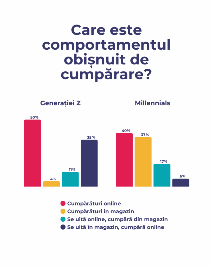 Deși au o preferință clară pentru cardurile de credit sau debit, Millennials adoptă un comportament de cumpărare mixt. Rutinele de cumpărături online și în magazine fizice sunt foarte apropiate: 40% preferă să cumpere online, în timp ce 37% preferă să meargă în magazin. Această diferență mică arată că această generație valorizează atât rapiditatea comerțului online, cât și experiența fizică în magazine.